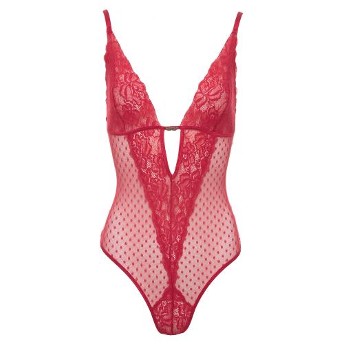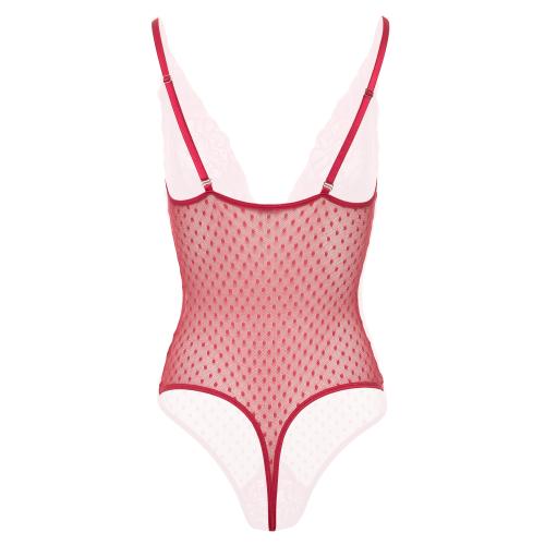 Luxe, sensuele body met open kruisje. Speels ontwerp met veel kant en polka dot design. Niet voorgevormde triangelcups. Verstelbare bandjes en accessoire aan de voorkant. Het materiaal is elastisch voor een fijne pasvorm.