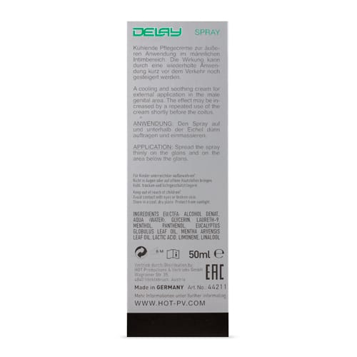 HOT Delay Verdovende Penis Spray is speciaal ontwikkeld is om de penis en eikel minder gevoelig te maken. Zo is het mogelijk om de zaadlozing langer uit te stellen. De samenstelling zorgen voor een licht verdovend effect, zodat externe prikkels wel binnenkomen, maar trager worden verwerkt.