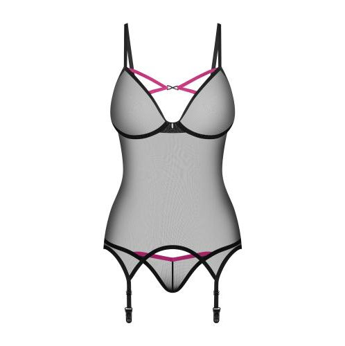 Subtiele lingerie die verleidt met intrigerende details! Het zwarte korset en de string uit de Novenes collectie omarmen subtiel het vrouwelijk lichaam. Met deze fijn aanvoelende doorschijnende stof, glanzende hanger tussen de borsten, kleurrijke bandjes en geïntegreerde jarretelbandjes blijf je de hele nacht in het middelpunt van de belangstelling staan.